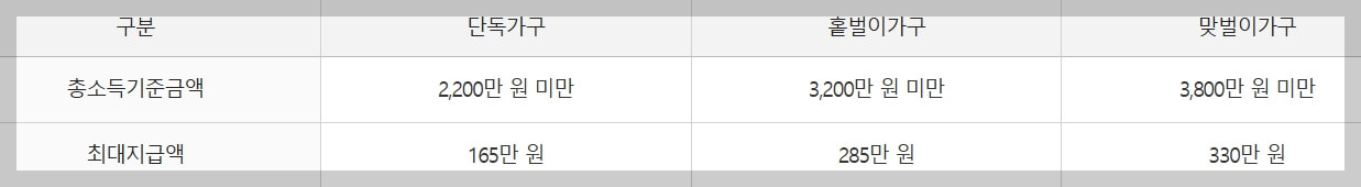 - 홑벌이 가구 또는 맞벌이 가구 : 7,000만 원 미만