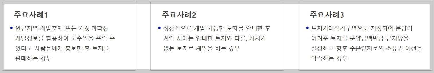 서민들이 매수가능한 금액(1천만 원 ∼ 5천만 원 정도)에 맞춰 필지를 분할하여 팔거나 지분으로 거래를 유도함으로써 다수의 소액투자자 피해를 양산하는 민생범죄로 다루고 있습니다.