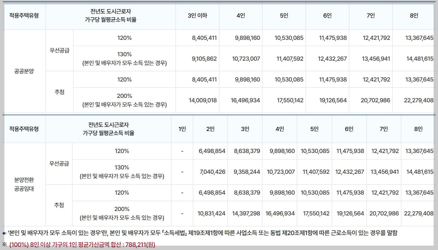 1. 다자녀 특별공급 대상 세대수의 90%를 전년도 도시근로자 월평균소득 기준의 120% 이하인 자(단, 본인 및 배우자가 모두 소득이 있는 경우에는 130%)에게 우선공급