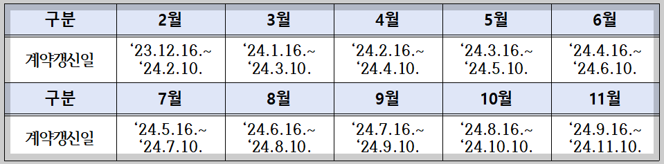 2) 부산시 신청 : 전입일로부터 3개월 이상 경과하고, 계약갱신일(“임차계약 만기일” 의 다음날)을 아래 기간에 적용하여 해당 월(1~10일)에 신청