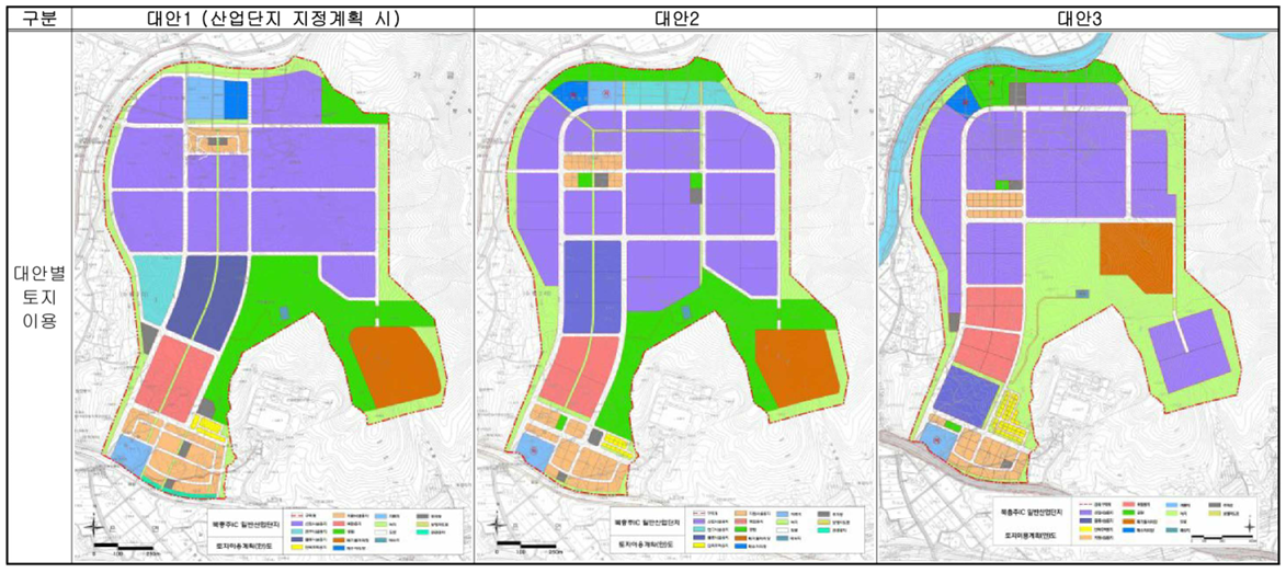 산업단지 지정계획 시(면적 1,697,911㎡, 충청북도 고시 제2020-166호) 사업계획을 "대안 1"로 설정하고, 가용지를 최대한 확 보할 수 있는 계획을 "대안 2"로 설정하였고, 지형변화를 최소화 한 계획을 "대안 3(면적 1,691,235.2㎡)"으로 설정함