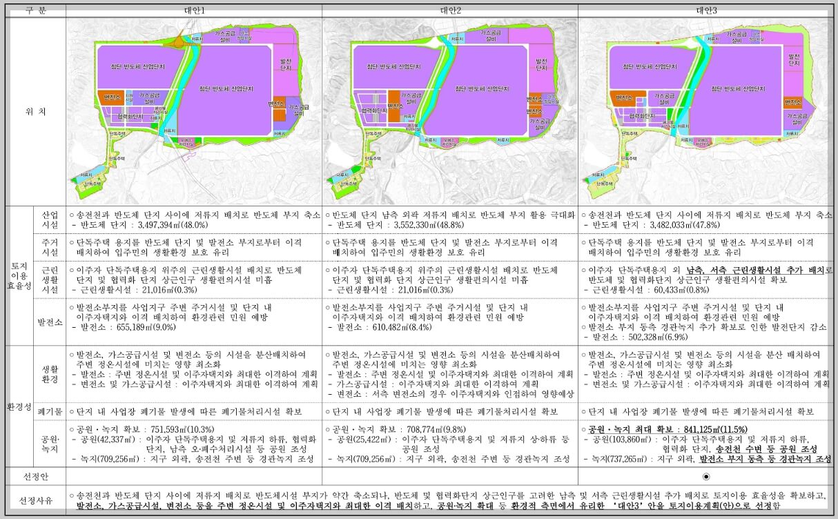송전천과 반도체 단지 사이에 저류지 배치로 반도체시설 부지가 약간 축소되나, 반도체 및 협력화 단지 상근인구를 고려한 남측 및 서측 근린생활시설 추가 배치로 토지이용 효율성을 확보하고, 발전소, 가스공급시설, 변전소 등을 주변 정온시설 및 이주자택지와 최대한 이격 배치하고, 공원·녹지 확대 등 환경적 측면에서 유리한 '대안 3' 안을 토지이용계획(안)으로 선정함