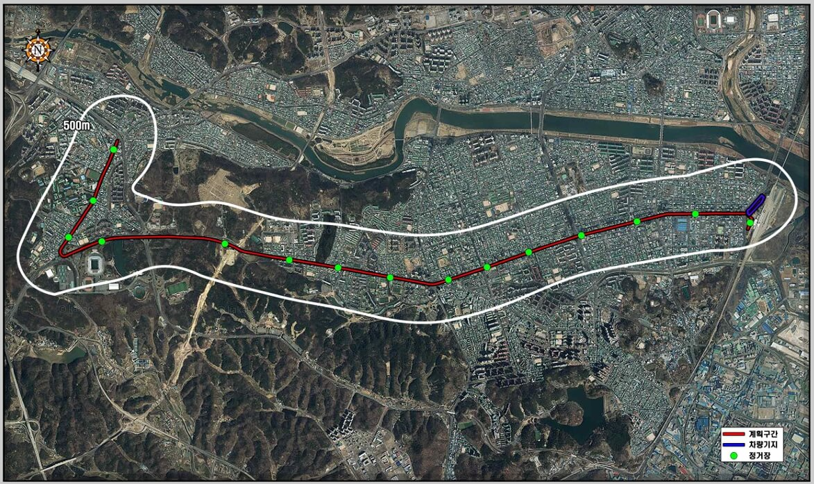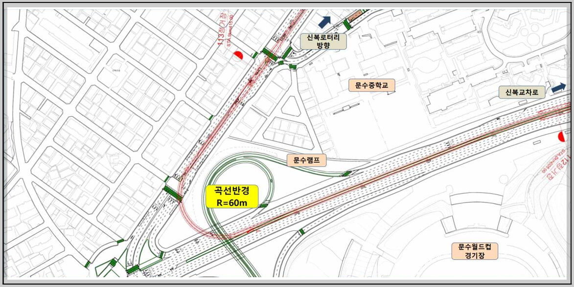 무거삼거리 통과노선의 평면곡선 반경은 60m로 설계기준(R=25m이사)은 만족하나, 향후 열차운영 및 유 리관리 등을 고려하여 차량시스템 제작사와 협의하여 기본계획 수립