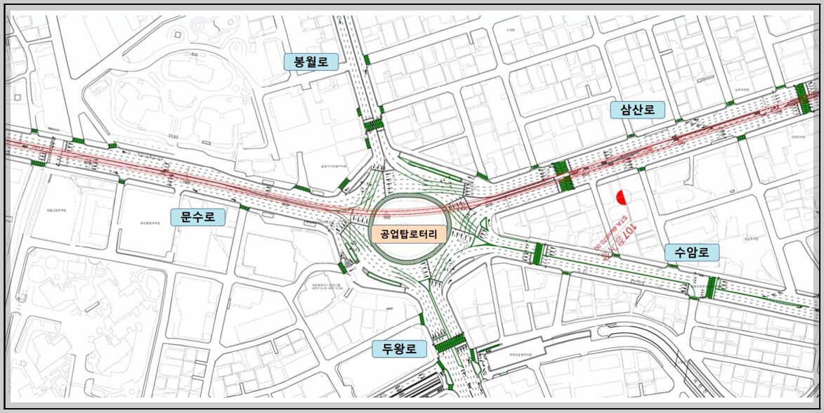 문수로, 삼산로, 봉월로, 두왕로, 수암로 5개로 도로가 합류되는 구간으로 트램노선이 지상 노면으로 계획되어 기존 교통량과 연계한 신호체계 및 도로구조 변경