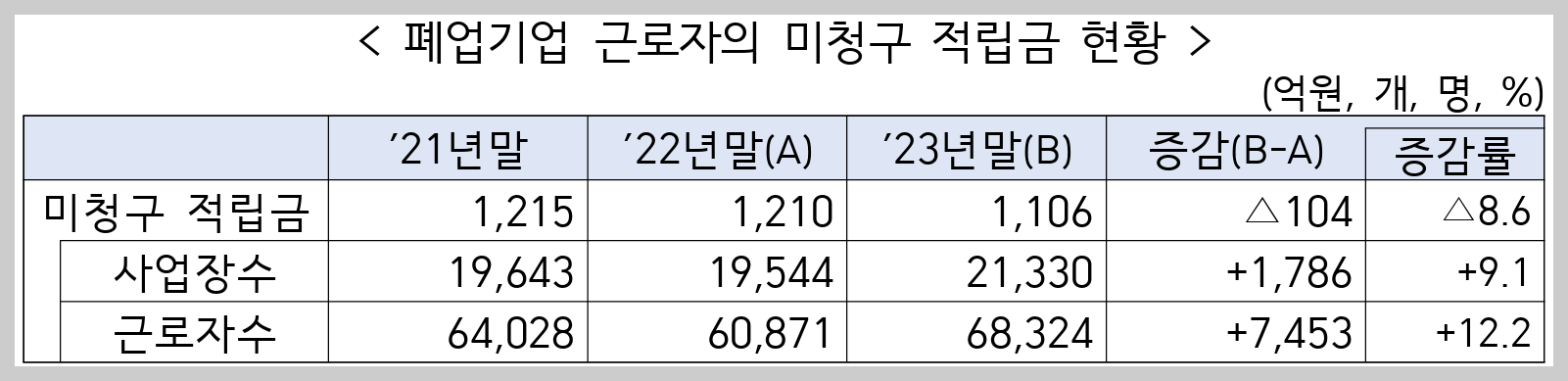 전년말 1,210억 원 대비 소폭 하락(△104억 원)했으나, 폐업 사업장수는 1,786개(9.1%) 증가했고 이로 인해 퇴직연금을 찾지 않은 근로자수도 7,453명(12.2%) 증가한것으로 나타났습니다.