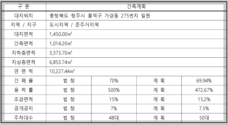 근린생활시설 대지면적 1,450㎡ 중 건축면적 1,014.20㎡, 연면적 10,227.44㎡로 건폐율 69.94%, 용적률 427.67% 로 계획을 하였습니다.